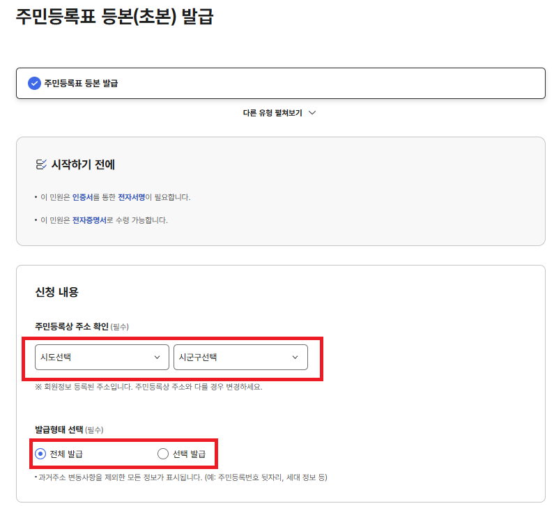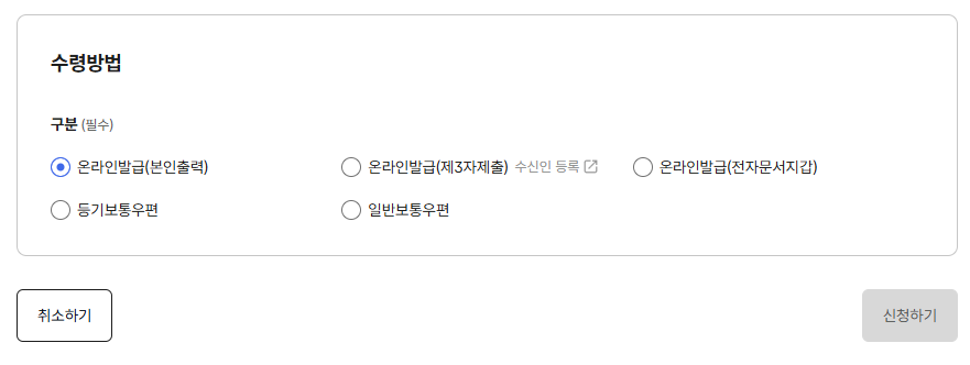 다음으로는 주민등록상 주소, 발급형태, 수령방법을 선택해주세요. 전체 발급 시 주민등록번호 뒷자리, 세대정보 등 과거 주소 변동사항을 제외한 모든 정보가 표시됩니다. 수령방법은 정부24 주민등록등본 인터넷발급 시에는 '온라인발급(본인출력)'을 눌러주시면 됩니다. 이외에도 편한 방법이 있다면 변경해도 좋아요.