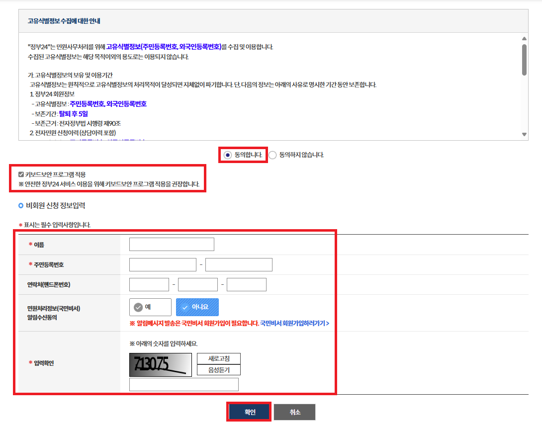 그 후, 이름, 주민등록번호, 연락처, 입력확인번호 등 아래 인적사항을 작성하면 됩니다. 휴대폰번호는 필수는 아니니 적지 않으셔도 무방합니다.