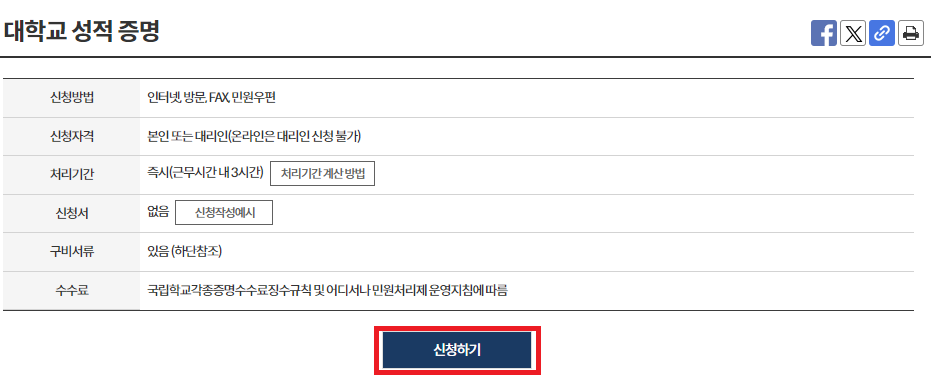 정부24 홈페이지에서 대학교 성적 증명 '신청하기'를 눌러주세요.