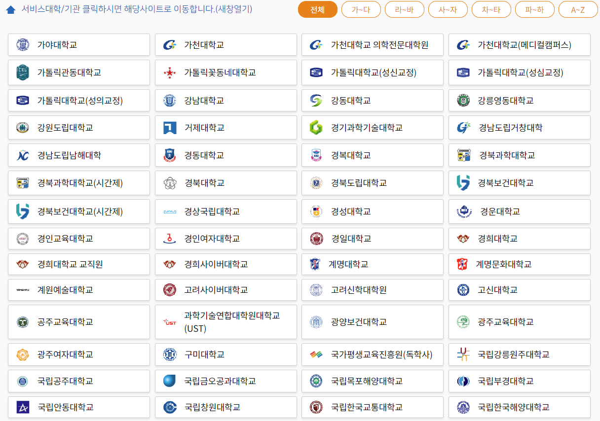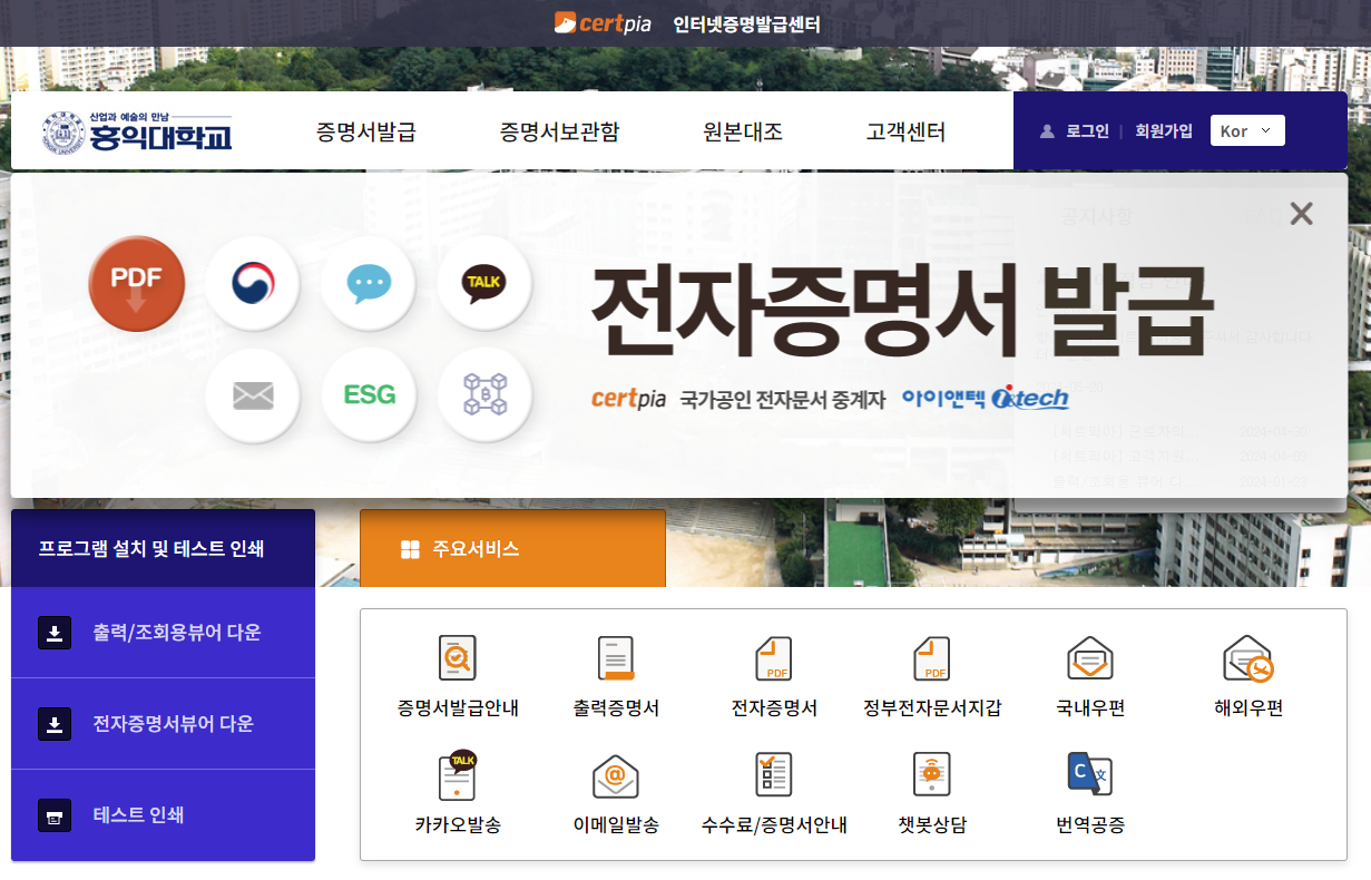 홍익대학교를 예로 들어, 홈페이지에 접속해보았습니다. 주요서비스란에서 본인이 이용하고 싶은 항목을 선택하면 됩니다. 학교만 리스트업 되어있다면 편리하게 이용할 수 있는 써트피아.