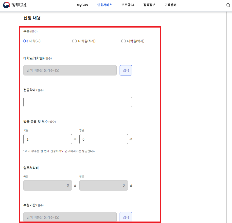 대학교, 전공학과, 발급종류, 부수, 수령기관을 선택해주세요. 정부24로 대학교 성적증명서 인터넷발급을 받는 경우에는 직접 선택한 수령기관으로 받으러 가야 합니다. 수수료 또한 1,000 ~ 3,000원 사이로 발생하므로 현금을 지참하심이 좋습니다. 여러 부수를 신청하더라도 업무처리비는 동일하며, 수수료는 운영지침에 따라 조금씩 상이할 수 있습니다.