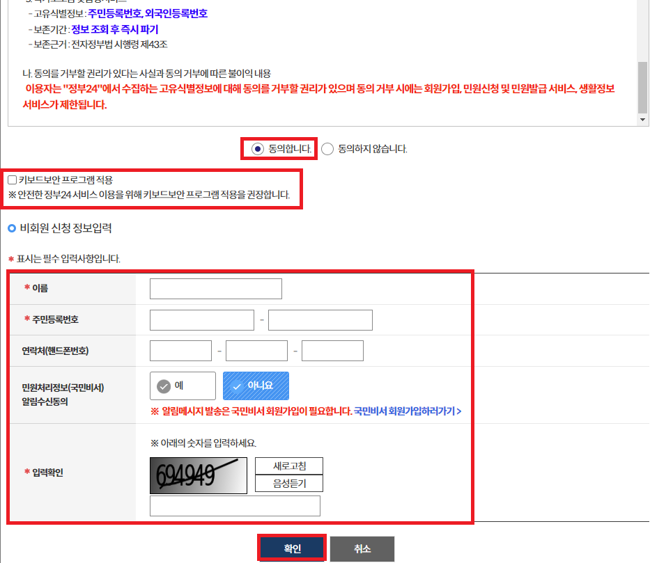 정보제공 동의 및 인적사항을 입력해준 후 '확인' 버튼을 클릭해주세요.