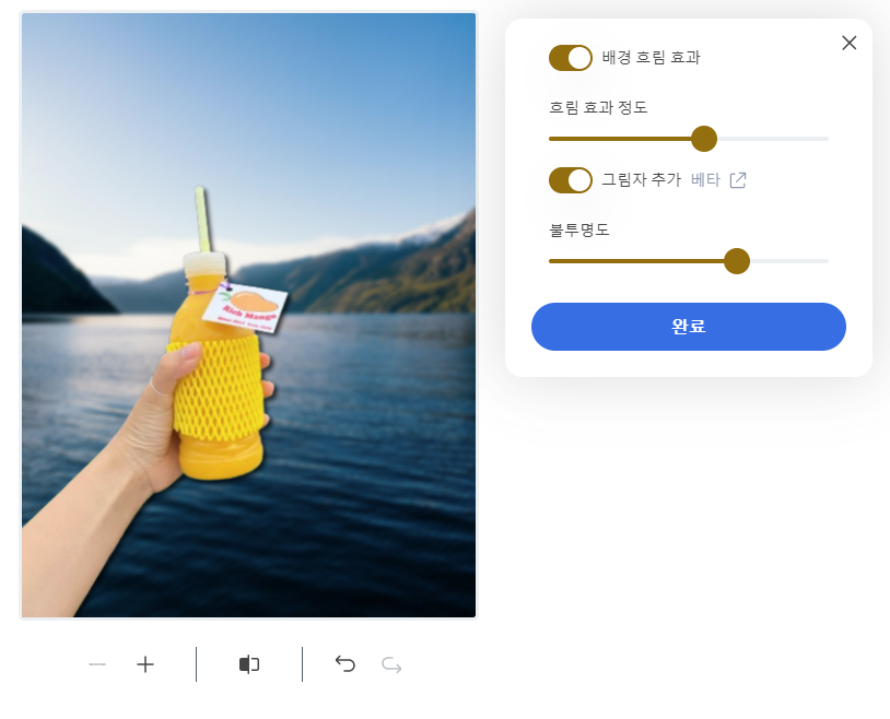 개체만 강조하고 싶다면 '배경 흐림 효과'를 넣어보세요. 흐림 효과 정도도 선택할 수 있습니다. 개체에 '그림자 추가'도 가능한데요. 스티커처럼 보이는 효과가 있답니다. 불투명도도 마찬가지로 조절이 가능해요.