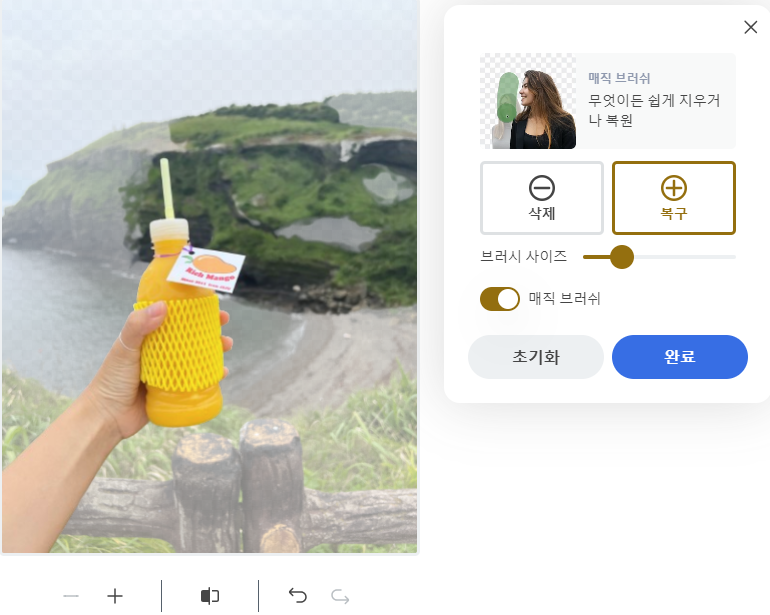 배경의 일부를 남기고 싶을 때는 지우기/복원 기능을 이용해보세요. 브러시 사이즈 조절도 가능해요. 원하는 크기 만큼 배경을 되살릴 수 있답니다.