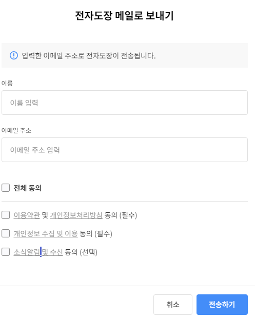 이름, 이메일주소를 입력한 후 전자서명 만들기 한 이미지를 발송할 수 있습니다.