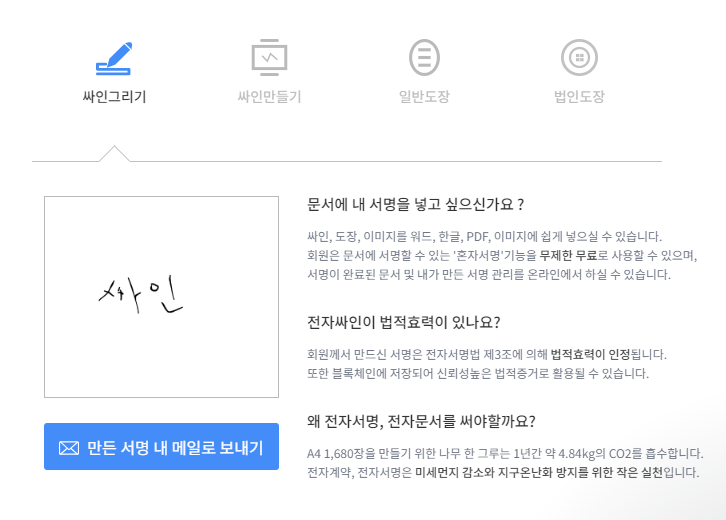 '싸인만들기' 메뉴를 통해 손글씨체로 전자서명을 만들 수 있는데요. 문구만 입력하면 바로 변환되기 때문에 빠르고 편해요. 깔끔한 필체라 보기 좋아서 비즈니스용으로 사용하기 좋습니다.