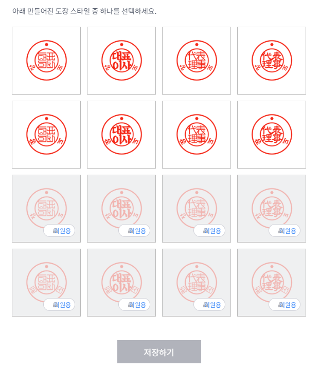 법인 회사의 경우 법인 전자도장도 만들 수 있습니다. 사명을 입력하면 우측 사진처럼 다양한 샘플이 나와요. 아래쪽에 '회원용'이라고 라벨이 붙은 것들은 글로싸인 회원만 이용할 수 있으니 참고하시기 바랍니다.