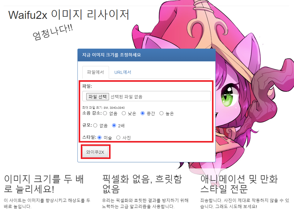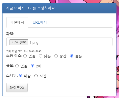 소음 = 노이즈 이기 때문에, 저는 노이즈를 강하게 없애는 것으로 선택했어요. 규모는 2배로 선택했구요. 스타일은 애니메이션과 실제 사진 중 어떤 건지 선택하는 것 같은데, Waifu2x의 경우 일반 사진보다는 애니메이션 이미지를 고화질로 바꾸는 데 최적화되어있다고 합니다.