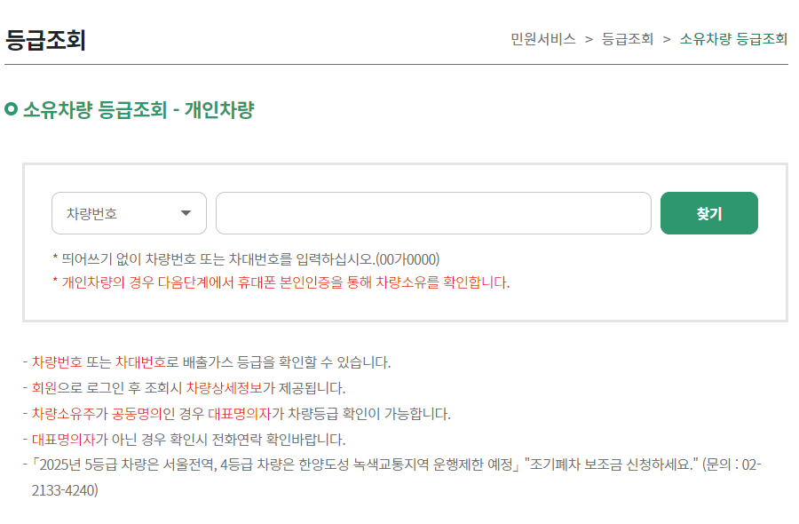 회원으로 로그인 후 조회 시 차량 상세정보가 제공되며, 차량소유주가 공동명의인 경우 대표명의자가 차량등급 확인이 가능합니다. 대표명의자가 아닌 경우에는 1833-7435로 문의하여 확인할 수 있습니다.
