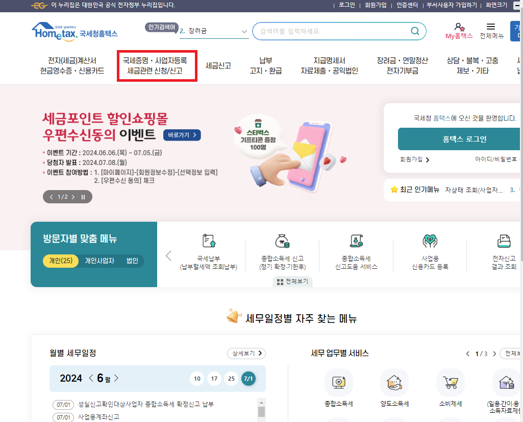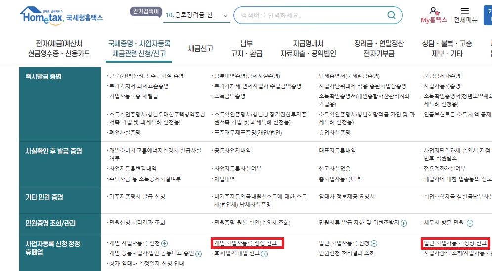 홈택스 > 국세증명/사업자등록/세금관련 신청/신고 > 사업자등록 신청/정정/휴폐업 > 개인/법인 사업자등록 신청
