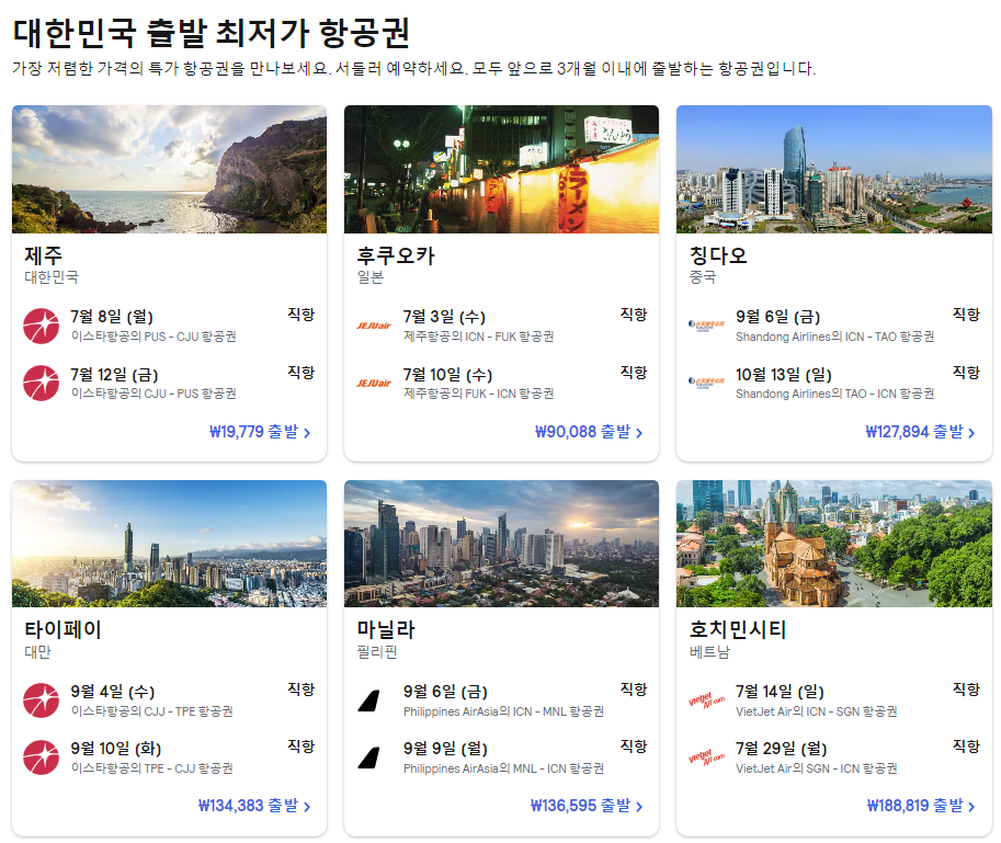 이렇게 3개월 이내 출발하는 특가 항공편 모음도 따로 확인할 수 있습니다. 목적지를 아직 정하지 못했다면 특가 항공편을 보고 정해도 괜찮겠네요.