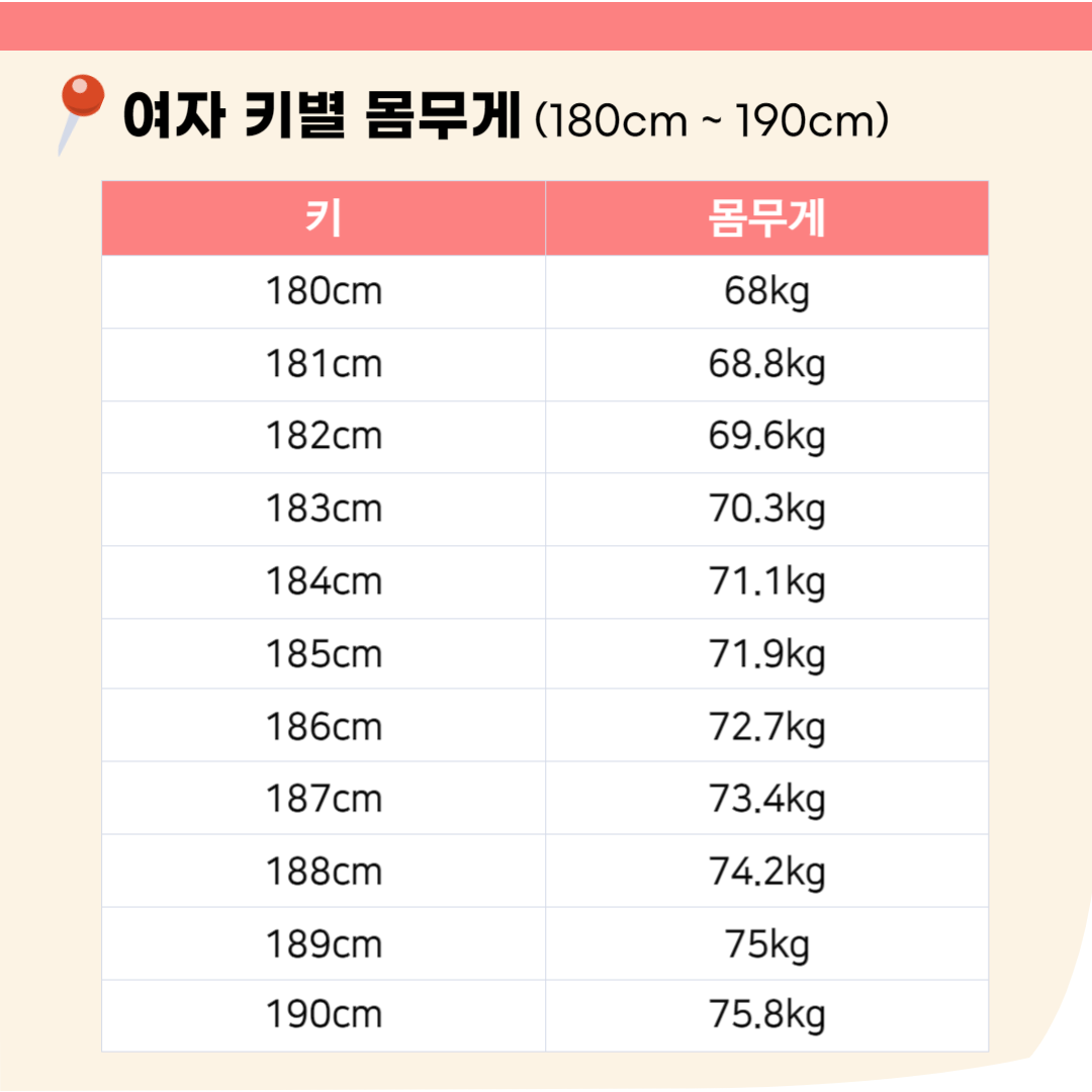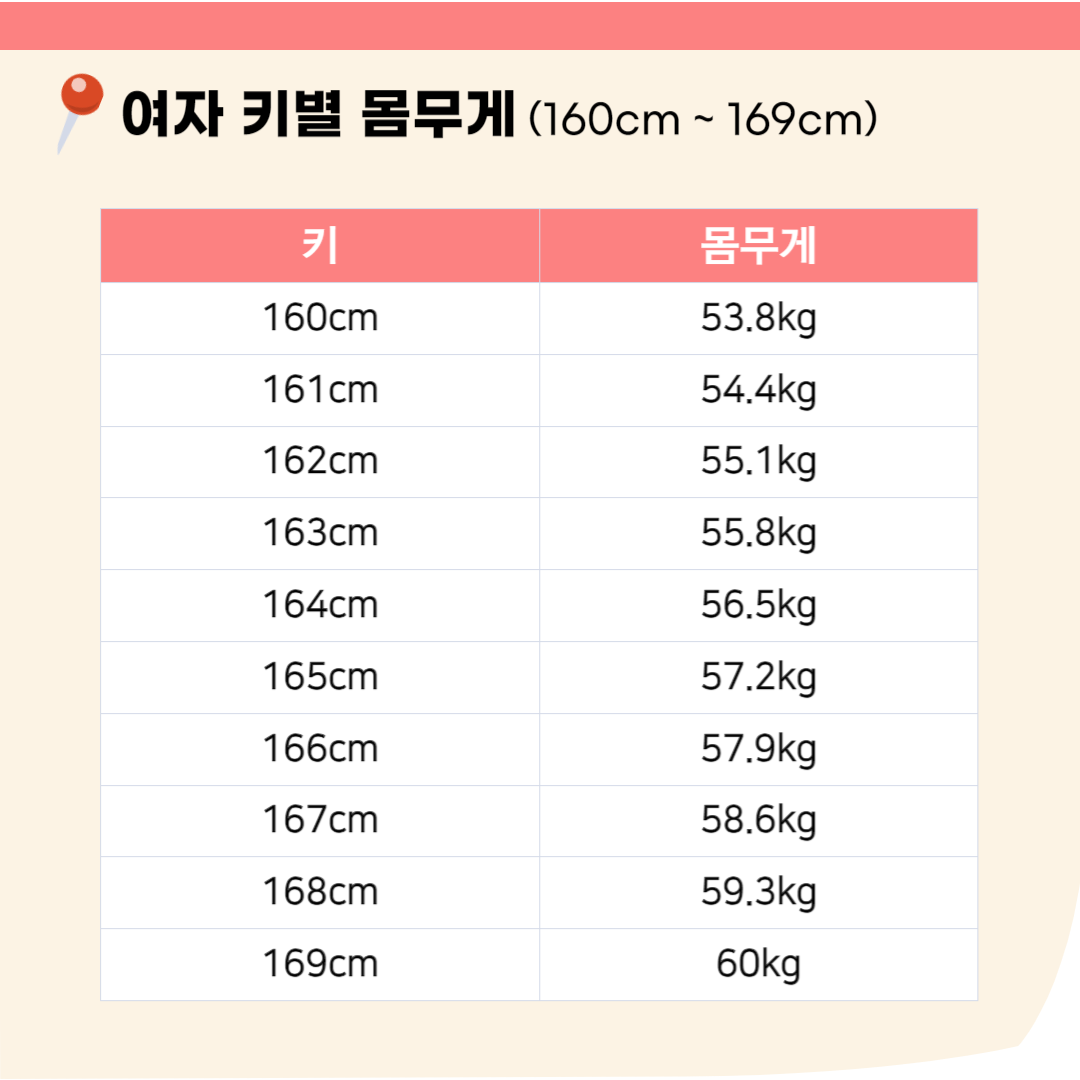 오늘은 여자 키별 몸무게 150cm부터 190cm에 해당하는 내용을 알려드릴텐데요. 아래 표보다 많이 나가더라도 위아래로 10% 정도는 정상체중에 속하니 참고하셔서 현재 몸 상태를 진단해보시기 바랍니다.