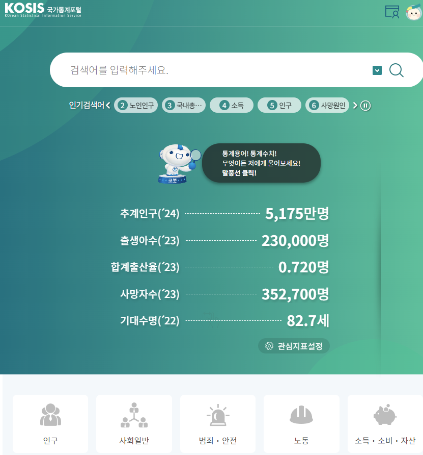 무료 논문 사이트 KOSIS는 우리나라의 거의 모든 통계를 확인할 수 있는 국가사이트에요. 레포트의 정확도를 뒷받침하기 좋은 통계자료는 PPT에 삽입하기 너무 좋은 소재에요. 실제로 조사하고 통계를 내는 것은 대학생들에게 무리가 있기 때문에 KOSIS 국가통계포털을 활용하시를 너무나도 추천드려요. '설마 이런 것도 있겠어?'라고 생각하는 것들도 있다고 하니 재미삼아 검색해보아도 좋습니다.