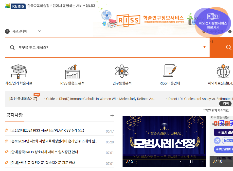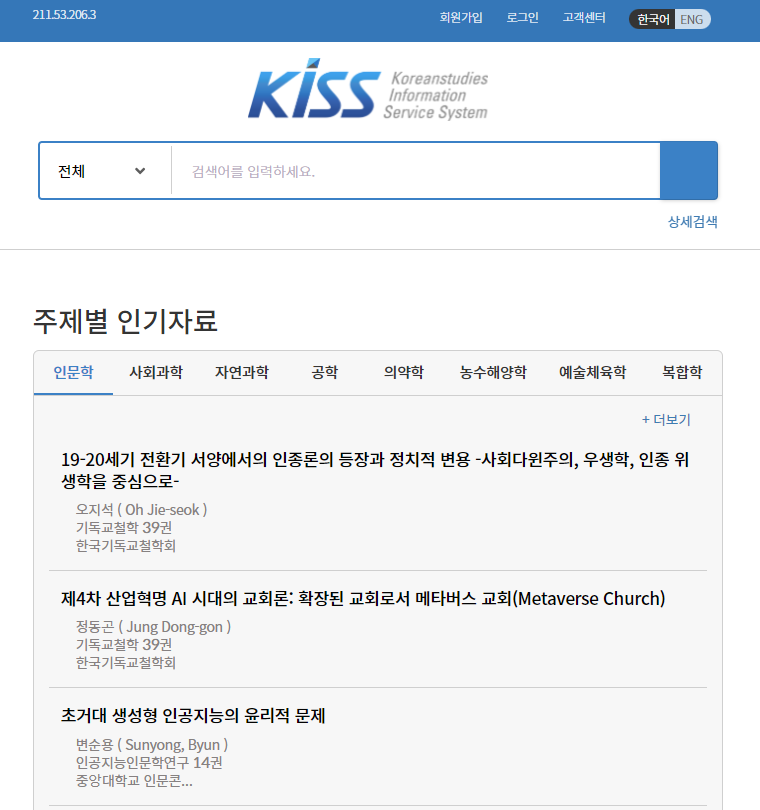 KISS는 RSS보다 무료보다는 유료의 비율이 더 높은데요. 제휴대학인지 먼저 확인하고 찾아보심을 추천드립니다. 2,728곳의 발행기관과 5,496종의 간행물, 2,948,334건의 논문을 보유하고 있는 무료 논문 사이트에요. 인문학, 사회과학, 공학, 의약학, 복합학 등 주제별 인기 자료를 찾아볼 수 있습니다.