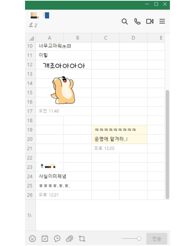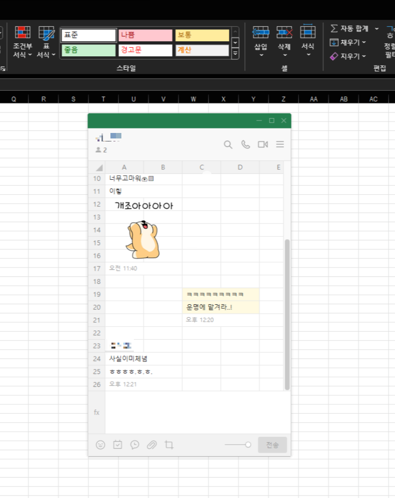 실제 엑셀 프로그램 위에 띄우니 더 티가 안납니다. 하지만 아는 분들은 이게 카톡인지 아시겠지만요. 그래도 파란 카카오톡 배경보다는 티가 덜 나니 멀리서 봤을 때 일하고 있구나 하거든요. 대놓고 딴짓을 하는 것보다는 조금이라도 덜 티나게 딴짓을 하는 게 직장에서의 예의인 것 같습니다.