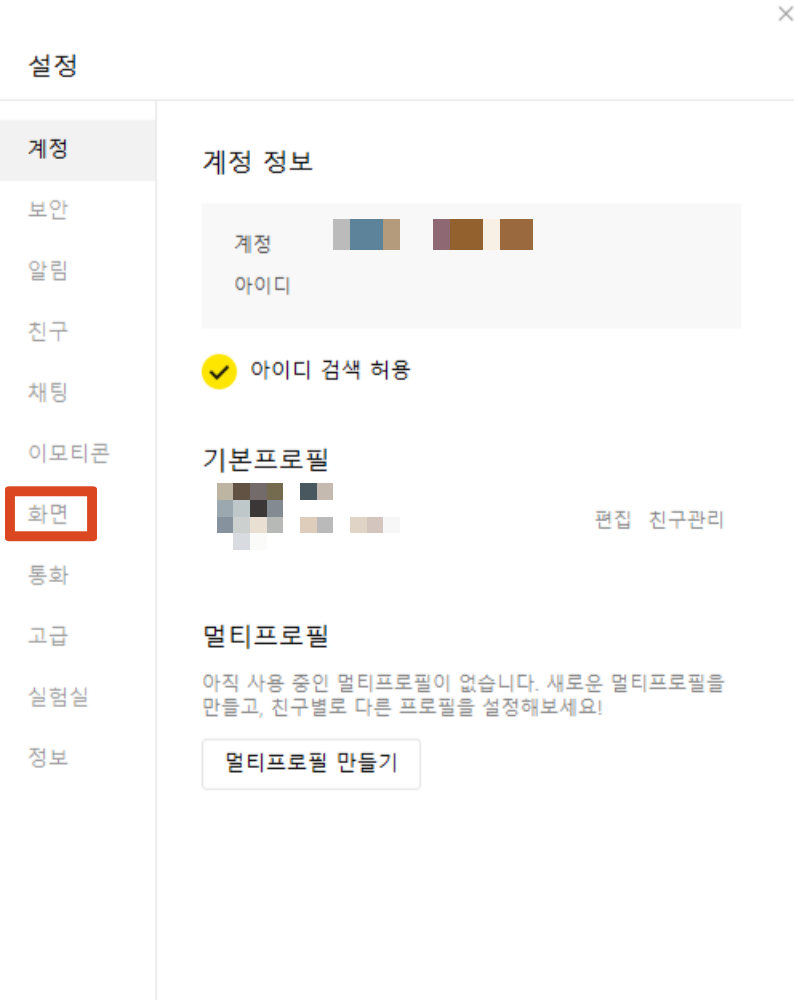 우선 PC 카톡 메인에서 좌측 하단에 있는 톱니바퀴 설정 버튼을 클릭해줍니다. 그러면 계정, 보안, 알림, 친구, 채팅 등 다양한 목록이 뜨는데 그중에 '화면'을 클릭해 주세요.