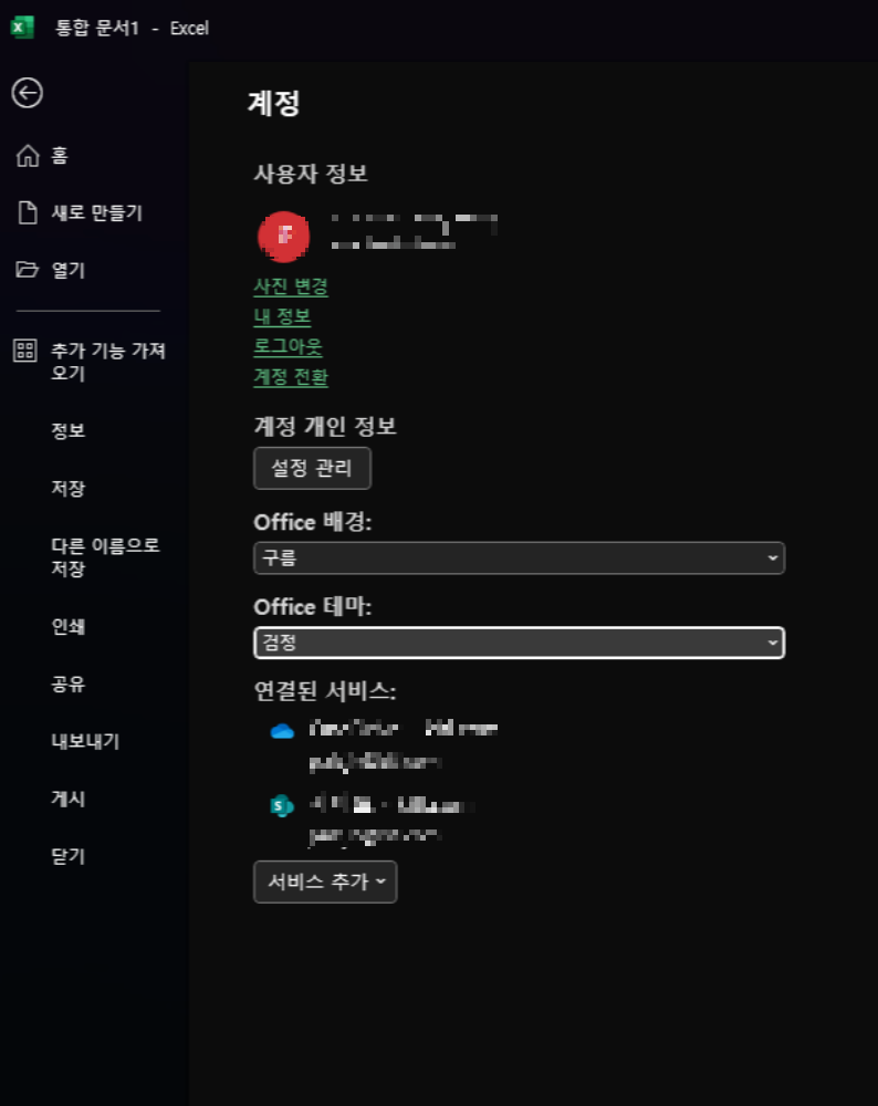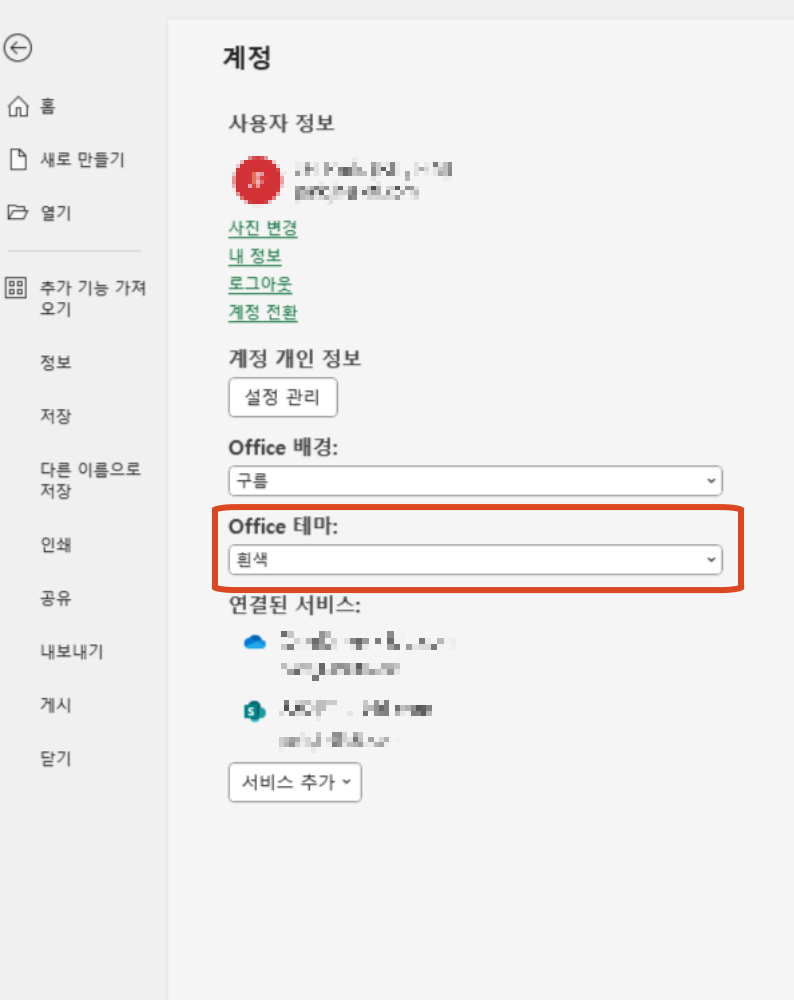 2. 왼쪽 바 하단 '계정' 클릭 > Office 테마 '블랙' 선택