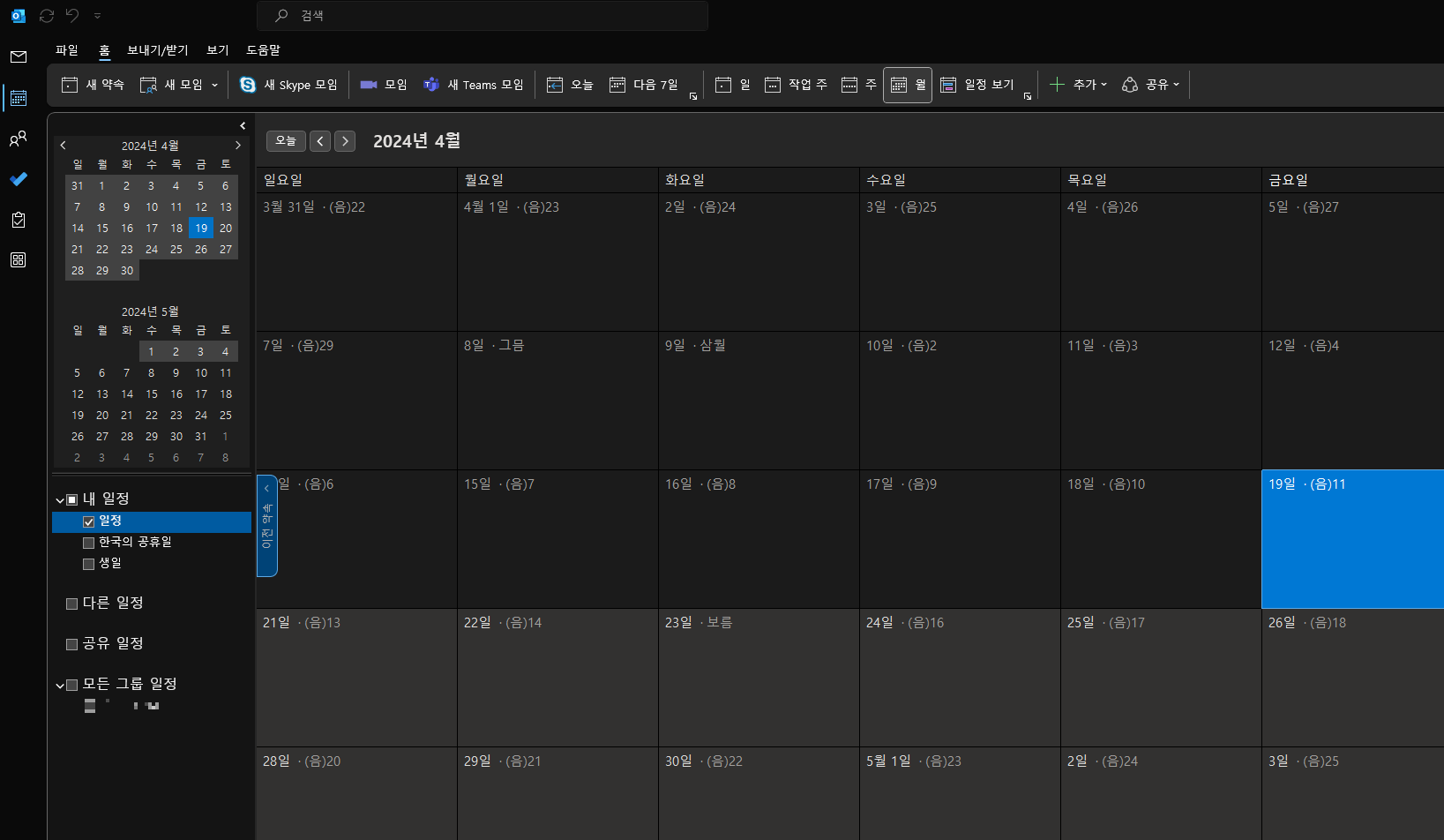 아웃룩은 전체 배경이 검정이고 글씨가 흰색이에요. 이렇게 어플마다 조금씩 차이는 존재한답니다. 처음에 적응하기까지 조금은 낯설긴 하지만 한번 적응되면 블랙이 눈이 편해서 좋아요. 소중한 눈 최대한 아껴쓰자구요 :)